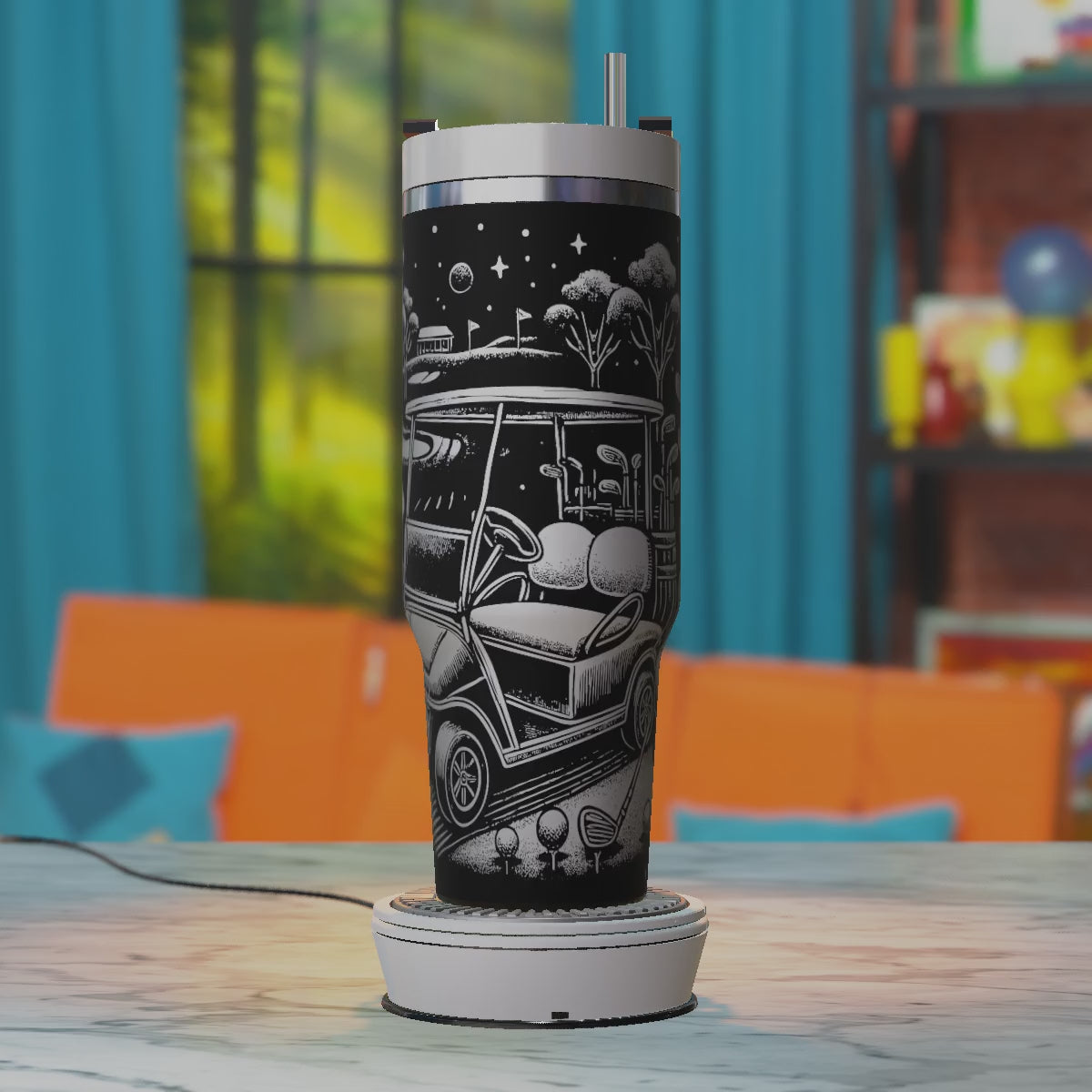 Dynamic golf club and cart engraving SVG for 40oz tumblers. Designed for golf lovers and sports enthusiasts looking for a bold tumbler engraving template.